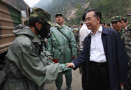 Chinese Premier Wen Jiabao (R) shakes hands with a soldier in Beichuan, southwest China's Sichuan Province, on May 22, 2008. Wen Jiabao made his second trip to the quake-battered zone on Thursday afternoon to oversee disaster relief work. (Xinhua/Yao Dawei) |