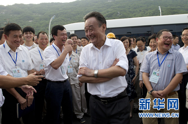 9月5日至7日,中共中央政治局常委、全国人大常委会委员长吴邦国在福建调研。这是吴邦国在平潭综合实验区金井湾组团工地同正在施工建设的闽台员工亲切交谈。新华社记者 李学仁 摄