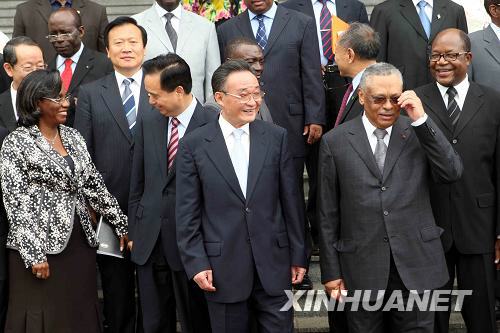 11月7日,正在加蓬进行正式友好访问的全国人大常委会委员长吴邦国在利伯维尔会见加蓬参议长科尼凯。这是会谈后,吴邦国与科尼凯(前右一)等愉快合影。新华社记者刘卫兵摄