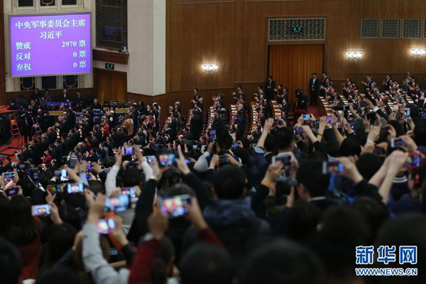 3月17日,十三届全国人大一次会议在北京人民大会堂举行第五次全体会议。习近平全票当选为国家主席、中央军委主席。 新华社记者 金立旺 摄