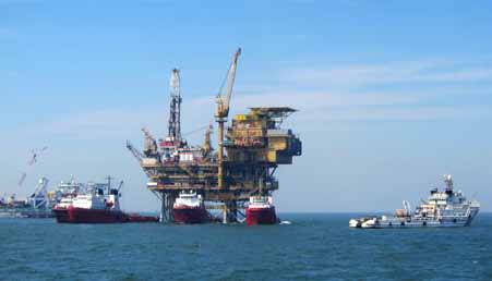 6月4日、6月17日,蓬莱19-3油田B平台和C平台分别发生溢油事故。8月16日,国家海洋局北海分局公开表示,将代表国家依据相关法律法规的规定,向溢油事故责任方提起海洋生态损害索赔诉讼。图为9月2日,收油船仍在蓬莱19-3油田C平台附近进行收油工作 摄影/张旭东
