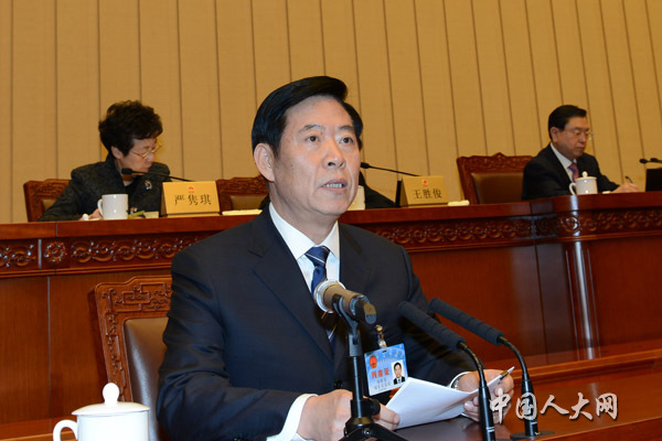 2月25日下午,十二届全国人大常委会第七次会议举行第一次全体会议,国家安全生产监督管理总局局长杨栋梁作关于安全生产法修正案草案的说明。马增科 摄