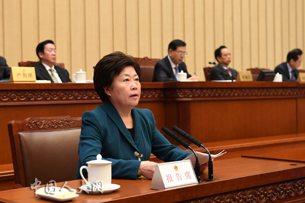 2月23日上午,十二届全国人大常委会第三十三次会议举行第一次全体会议。全国人大常委会副秘书长信春鹰作关于第十三届全国人民代表大会代表选举工作情况的报告。中国人大网 李杰摄