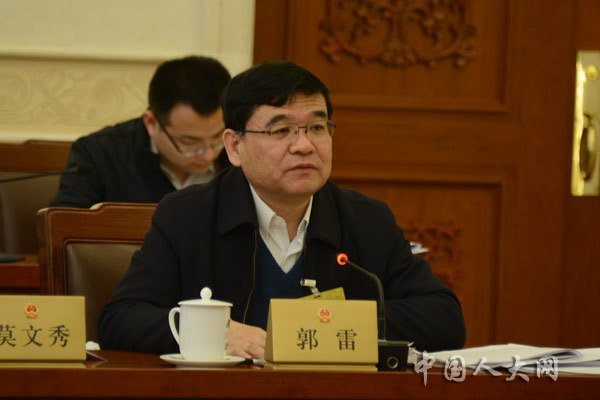 2月24日上午,十二届全国人大常委会第三十三次会议举行分组会,审议全国人大常委会工作报告稿,全国人大常委会执法检查组关于检查《中华人民共和国种子法》实施情况的报告,拟提请表决事项。图为全国人大常委会委员郭雷在分组会上发言。中国人大网 冯涛 摄