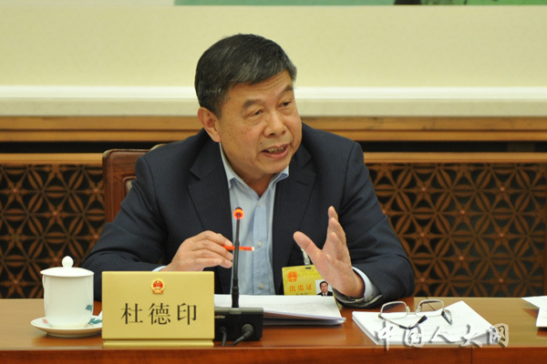 4月26日上午,十三届全国人大常委会第二次会议举行分组会议,审议全国人大常委会关于国务院机构改革涉及法律规定的行政机关职责调整问题的决定草案,关于在上海设立金融法院的决定草案,第十三届全国人大常委会代表资格审查委员会主任委员、副主任委员、委员名单草案,任免案。图为全国人大常委会委员杜德印在分组会上发言。中国人大网 冯涛 摄