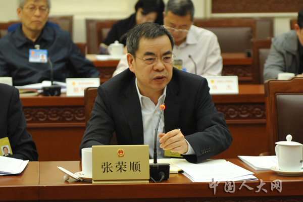 4月26日下午,十三届全国人大常委会第二次会议举行分组会议,审议国务院关于2017年度环境状况和环境保护目标完成情况的报告、关于华侨权益保护工作情况的报告。图为全国人大常委会委员张荣顺在分组会上发言。中国人大网 冯涛 摄