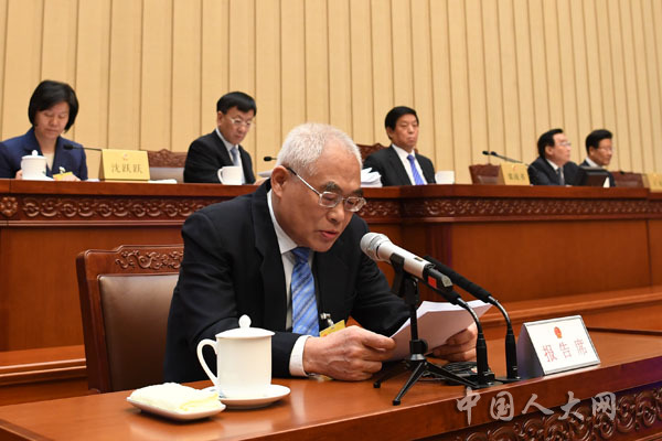 10月22日下午,十三届全国人大常委会第六次会议举行第一次全体会议。全国人大监察和司法委员会主任委员吴玉良作关于第十三届全国人民代表大会第一次会议主席团交付审议的代表提出的议案审议结果的报告。中国人大网 李杰摄