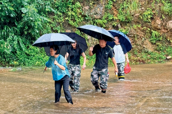 2024年7月,赵春梅代表(左一)与村干部涉水前去查看暴雨灾情。(代表供图)