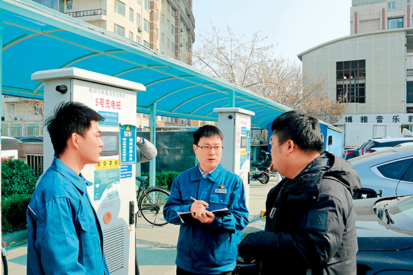 冯涛代表(中)到电动汽车充电站调研充电基础设施及运营情况。(代表供图)