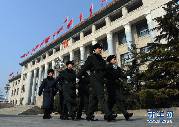 全国政协十二届二次会议将于3月3日在北京召开,2014年全国两会的帷幕也就此拉开。图为安保人员走过大会堂门前(3月2日摄)。新华网翟子赫 摄