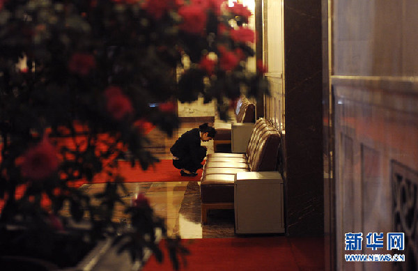 全国政协十二届二次会议将于3月3日在北京召开,2014年全国两会的帷幕也就此拉开。图为人民大会堂工作人员做准备工作(3月1日摄)。新华网翟子赫 摄