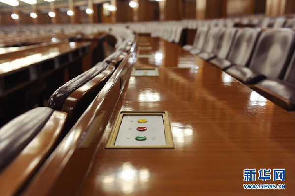 全国政协十二届二次会议将于3月3日在北京召开,2014年全国两会的帷幕也就此拉开。图为人民大会堂内的坐席(3月2日摄)。新华网翟子赫 摄