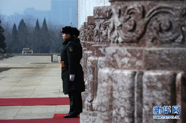 全国政协十二届二次会议将于3月3日在北京召开,2014年全国两会的帷幕也就此拉开。图为安保人员在人民大会堂南门执勤(3月2日摄)。新华网翟子赫 摄