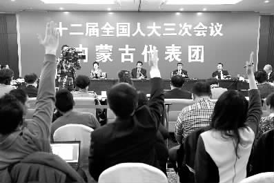 3月6日下午,内蒙古代表团举行媒体开放日活动,记者踊跃提问,场面热烈。检察日报记者张哲摄