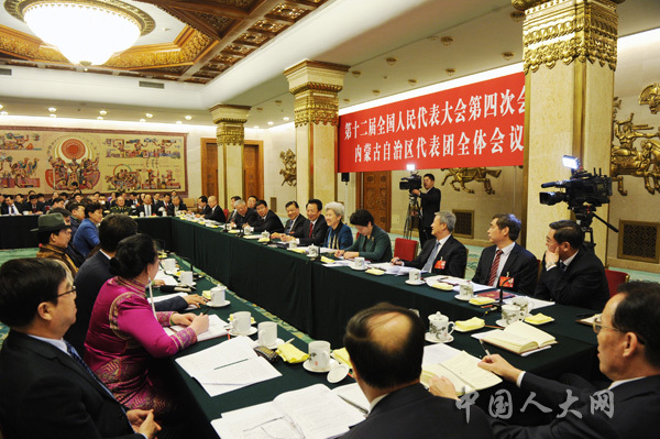 3月5日下午,十二届全国人大四次会议内蒙古代表团举行全体会议。中国人大网 李杰摄