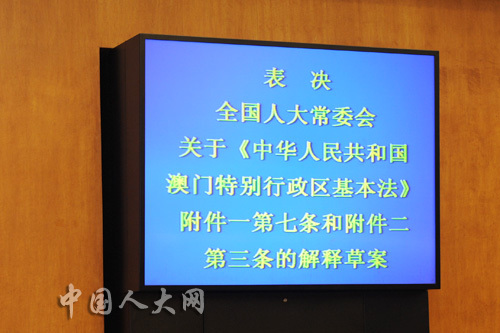 表决全国人大常委会关于《中华人民共和国澳门特别行政区基本法》附件一第七条和附件二第三条的解释草案