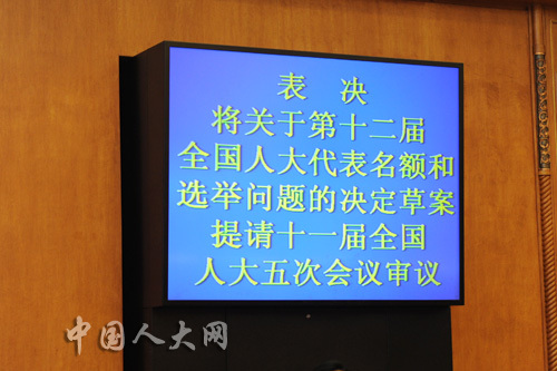 表决将关于第十二届全国人大代表名额和选举问题的决定草案提请十一届全国人大五次会议审议