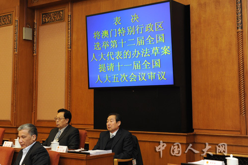 表决将澳门特别行政区选举第十二届全国人大代表的办法草案提请提请十一届全国人大五次会议审议