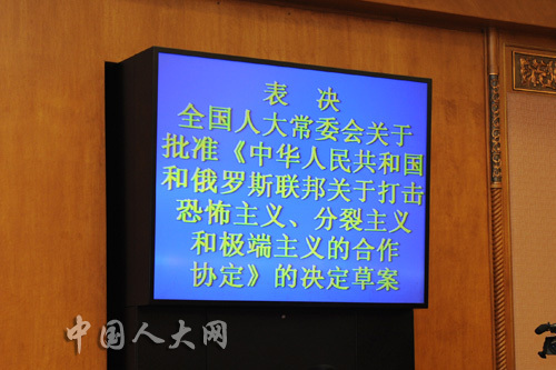 表决全国人大常委会关于批准《中华人民共和国和俄罗斯联邦关于打击恐怖主义、分裂主义和极端主义的合作协定》的决定草案