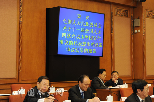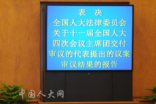 表决全国人大法律委员会关于十一届全国人大四次会议主席团交付审议的代表提出的议案审议结果的报告