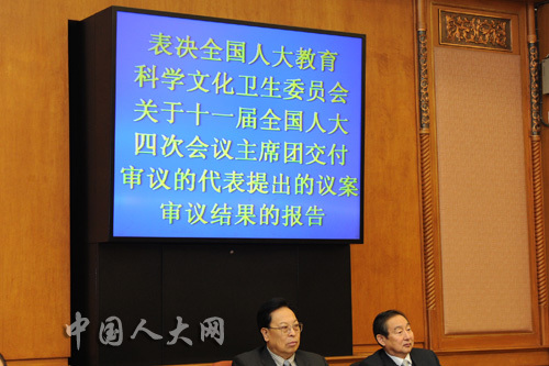 表决全国人大教育科学文化卫生委员会关于十一届全国人大四次会议主席团交付审议的代表提出的议案审议结果的报告
