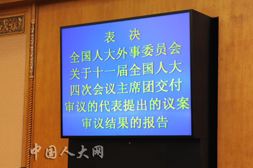 表决全国人大外事委员会关于十一届全国人大四次会议主席团交付审议的代表提出的议案审议结果的报告