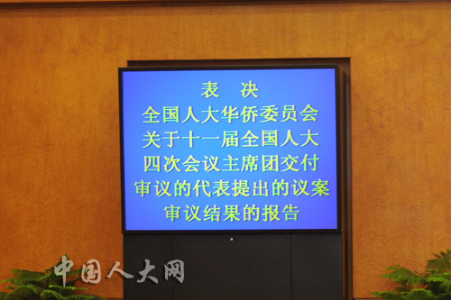 表决全国人大华侨委员会关于十一届全国人大四次会议主席团交付审议的代表提出的议案审议结果的报告
