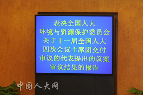 表决全国人大环境与资源保护委员会关于十一届全国人大四次会议主席团交付审议的代表提出的议案审议结果的报告