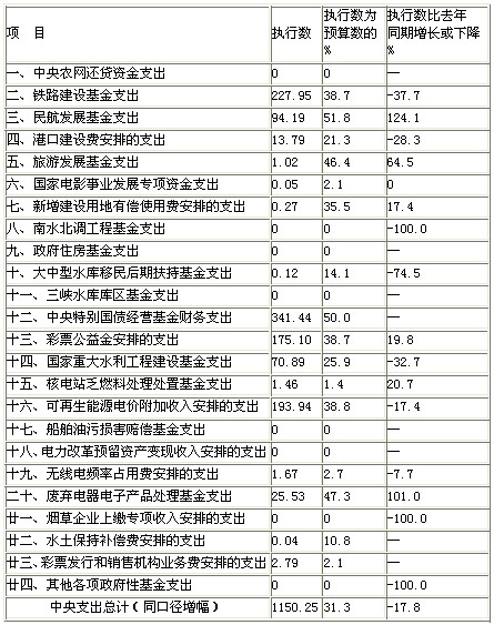 2.“执行数比去年同期增长或下降%”列中“—”表示去年同期该项目执行数为零。“廿三、彩票发行和销售机构业务费安排的支出”今年从原专户管理纳入政府性基金预算管理,原专户科目调整为政府性基金收支科目。