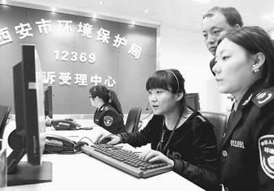 2013年10月24日,陕西省西安市环保局举行“12369环保热线开放日活动”,邀请市民代表接听投诉电话,了解投诉程序。新华社记者 丁海涛摄