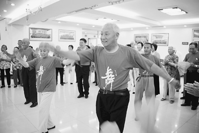 图为山东邹平县西王老年公寓的老人在编排舞蹈自娱自乐。