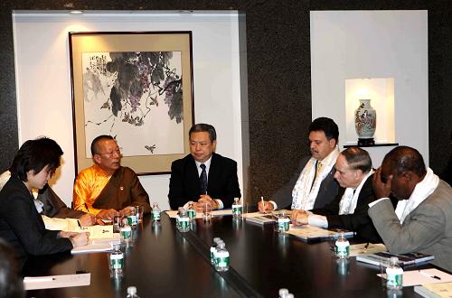 3月19日,中国全国人大西藏代表团团长、全国人大代表、西藏自治区人大常委会副主任新杂·单增曲扎活佛(右五)在美国纽约与美洲议会联盟副主席奥迪兹(右三)等会谈。当日,中国全国人大西藏代表团在纽约会见了纽约州、市议员,向他们介绍了西藏民主改革50年来各方面取得的巨大成就和发展变化。新华社记者袁满 摄