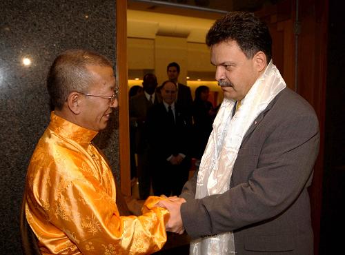 3月19日,在美国纽约,中国全国人大西藏代表团团长、全国人大代表、西藏自治区人大常委会副主任新杂·单增曲扎活佛(左)与美洲议会联盟副主席奥迪兹握手。当日,中国全国人大西藏代表团在纽约会见了纽约州、市议员,向他们介绍了西藏民主改革50年来各方面取得的巨大成就和发展变化。新华社记者袁满 摄