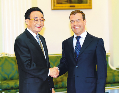梅德韦杰夫表示,俄中同为安理会常任理事国,是对世界有重要影响的新兴经济体。当前形势下,俄中加强合作,不仅有利于两国各自的发展,也有利于世界经济的恢复,促进建立公正合理的国际政治经济新秩序。俄方高度重视发展对华关系,重视加强两国议会间的交往与合作,愿继续深化与中方的战略互信,加强在能源、经贸、投资、地方等各领域全方位的合作,密切在国际事务中的协作,并通过纪念俄中建交60周年和互办“语言年”等活动,进一步巩固俄中关系的社会基础,不断提升两国关系的战略水平。