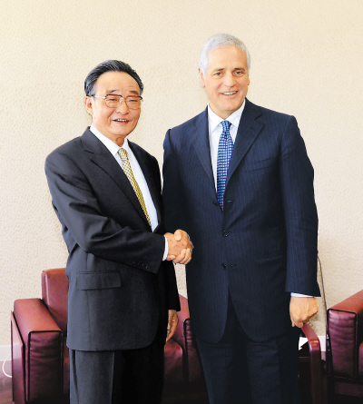 5月19日,正在意大利进行正式友好访问的全国人大常委会委员长吴邦国在米兰会见意大利伦巴第大区主席福尔米科尼。新华社记者 李 涛摄