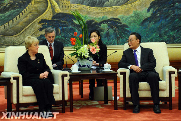 1月13日,全国人大常委会委员长吴邦国在北京人民大会堂会见来华出席中美议会定期交流机制会议的美国参议院代表团。新华社记者李涛摄