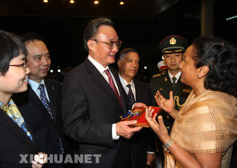 当地时间11月10日晚,中国全国人大常委会委员长吴邦国抵达塔那那利佛,开始对马达加斯加进行正式友好访问。马达加斯加国民议会议长西拉(前右一)到机场迎接。新华社记者刘卫兵摄