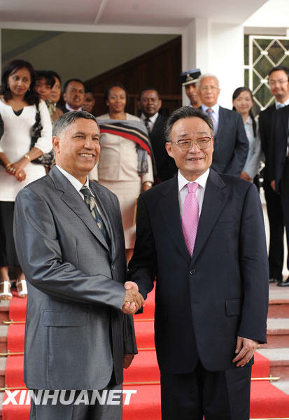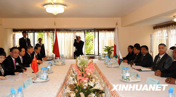 当地时间11月11日,正在马达加斯加进行正式友好访问的全国人大常委会委员长吴邦国在国民议会与马达加斯加国民议会议长西拉举行会谈。新华社记者高洁摄