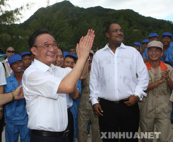 11月13日,正在塞舌尔进行正式友好访问的中国全国人大常委会委员长吴邦国在维多利亚考察中国援建塞舌尔的议会大厦工地,亲切看望参加施工的中国工人。前右为塞舌尔国民议会议长赫米尼耶。新华社记者刘卫兵摄