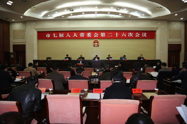 11月26日至27日,市七届人大常委会第二十六次会议召开,受市委书记、市人大常委会主任朱克江委托,市人大常委会副主任、党组副书记周德祥主持会议。市人大常委会副主任曹友琥、谷家栋、陈卫国、肖紫英,秘书长倪崇彦等出席会议。副市长马成志、吴晓丹、张京麒,市中级人民法院代院长王世华等列席会议。