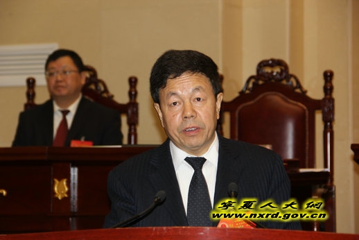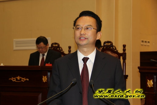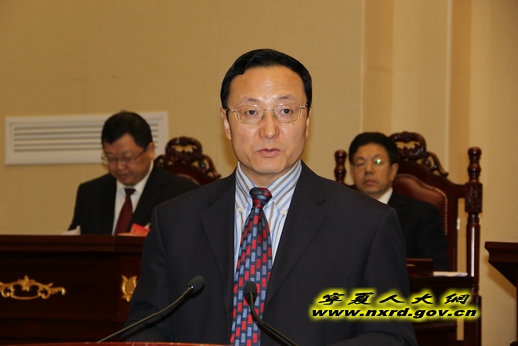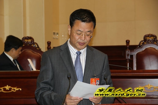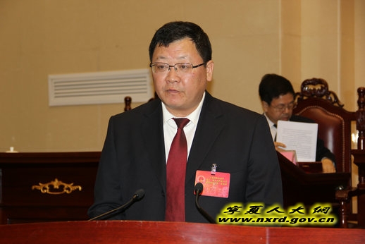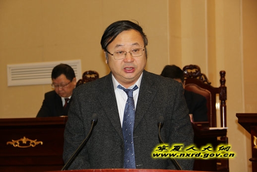 自治区地震局局长佟晓辉作关于宁夏回族自治区防震减灾条例(修订草案)的说明。(南海生/摄)