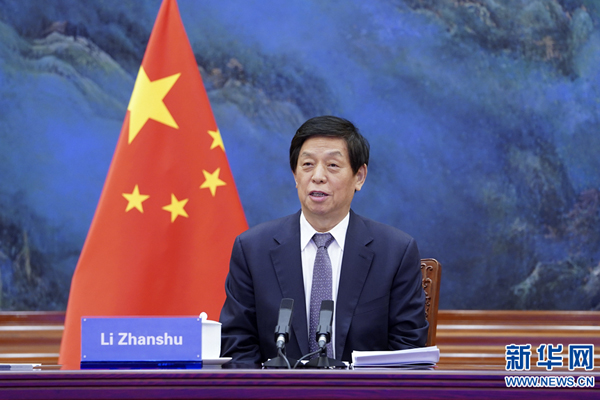 3月31日,全国人大常委会委员长栗战书在北京人民大会堂以视频方式同蒙古国国家大呼拉尔主席赞丹沙塔尔举行会谈。新华社记者 张领 摄