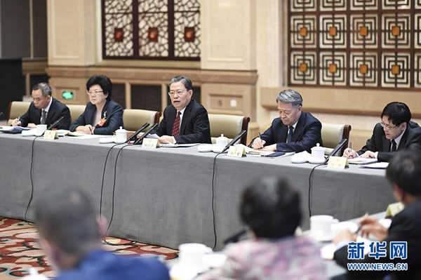 3月4日,中共中央政治局常委、全国人大常委会委员长栗战书看望出席全国政协十三届二次会议的民革、台盟、台联界委员并参加讨论。 新华社记者 王晔 摄