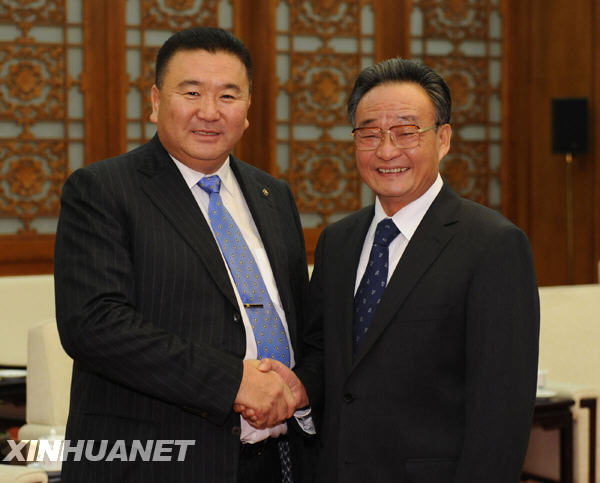 10月27日,全国人大常委会委员长吴邦国在北京人民大会堂会见蒙古国国家大呼拉尔副主席巴特呼。 新华社记者黄敬文摄