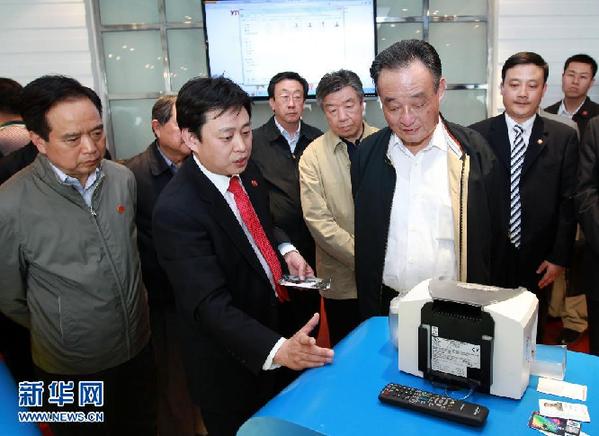 4月12日至17日,中共中央政治局常委、全国人大常委会委员长吴邦国在河南调研。这是4月15日,在位于焦作市的卓林数码材料有限公司,吴邦国听取企业生产与创新情况介绍。新华社记者 庞兴雷 摄