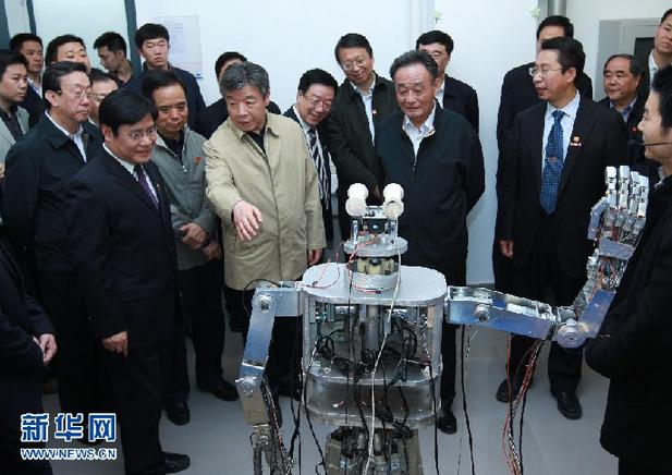 4月12日至17日,中共中央政治局常委、全国人大常委会委员长吴邦国在河南调研。这是4月14日,吴邦国在郑州大学新校区观看学生创新成果展示。新华社记者 庞兴雷 摄