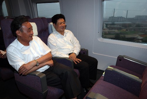 近日,中共中央政治局常委、全国人大常委会委员长吴邦国从北京南站乘坐京津城际高速列车到天津,并在天津考察工作。这是7月14日,吴邦国和中共中央政治局委员、全国人大常委会副委员长王兆国乘坐京津城际高速列车。(新华社记者姚大伟摄)