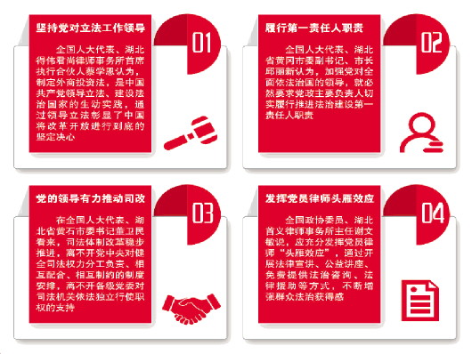 在接受《法制日报》记者采访时,部分代表委员认为,党的领导是法治国家、法治政府、法治社会建设的“主心骨”,只有不断加强党对全面依法治国的领导、把党的领导贯穿依法治国的全过程和各方面,才能为实现中华民族伟大复兴的中国梦提供坚实法治保障。