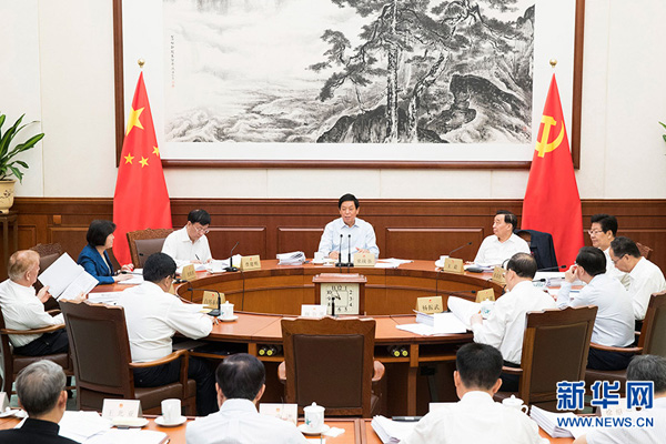 6月13日,全国人大常委会党组在北京召开会议,深入学习贯彻习近平总书记在“不忘初心、牢记使命”主题教育工作会议上的重要讲话精神,对开展主题教育作出部署。中共中央政治局常委、全国人大常委会委员长栗战书主持会议。 新华社记者 黄敬文 摄