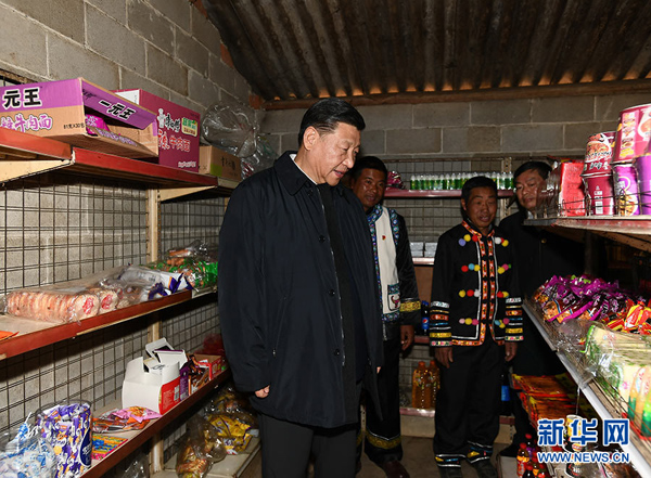 春节前夕,中共中央总书记、国家主席、中央军委主席习近平赴云南考察,看望慰问基层干部群众。这是1月19日下午,习近平来到腾冲市清水乡三家村中寨司莫拉佤族村看望乡亲们,走进村民家中了解脱贫攻坚情况,并向大家送上新春祝福。新华社记者 谢环驰 摄